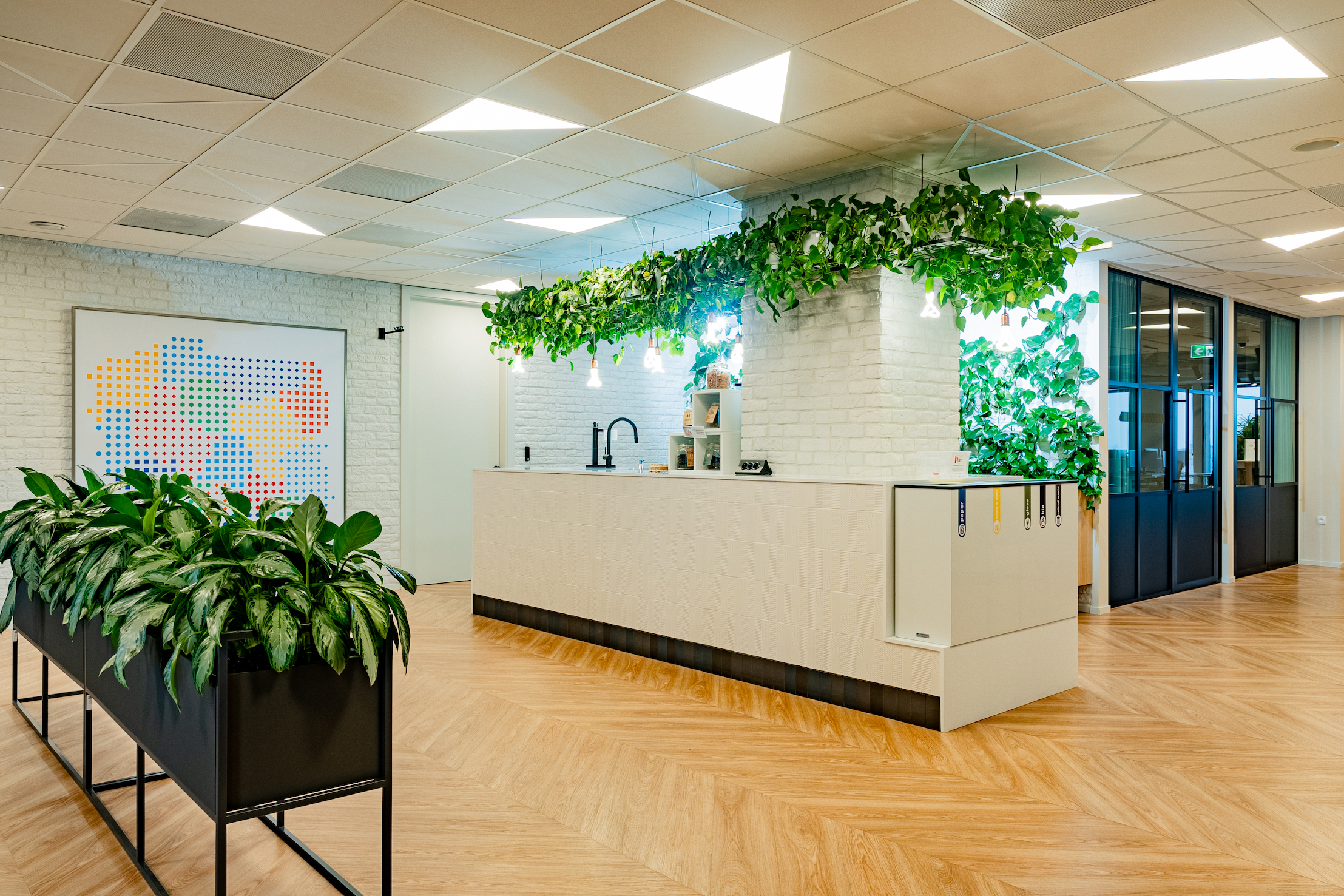 Kierownictwo firmy poprosiło nas o zainspirowanie się zielonymi projektami z Amsterdamu, gdzie zielone ściany, aranżacje z mchem i innowacyjne rozwiązania oświetleniowe stały się standardem w tworzeniu biur sprzyjających produktywności i komfortowi pracy.