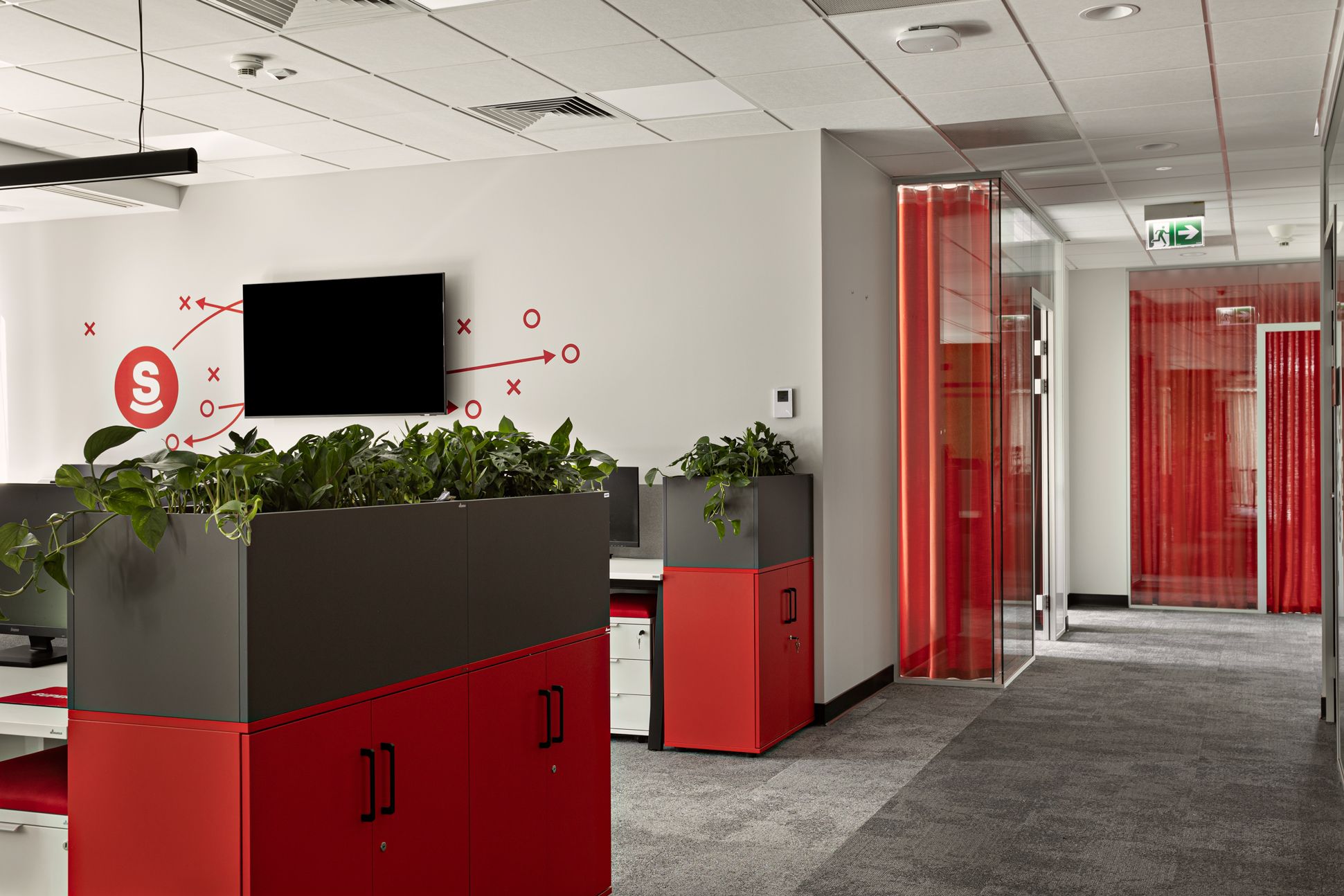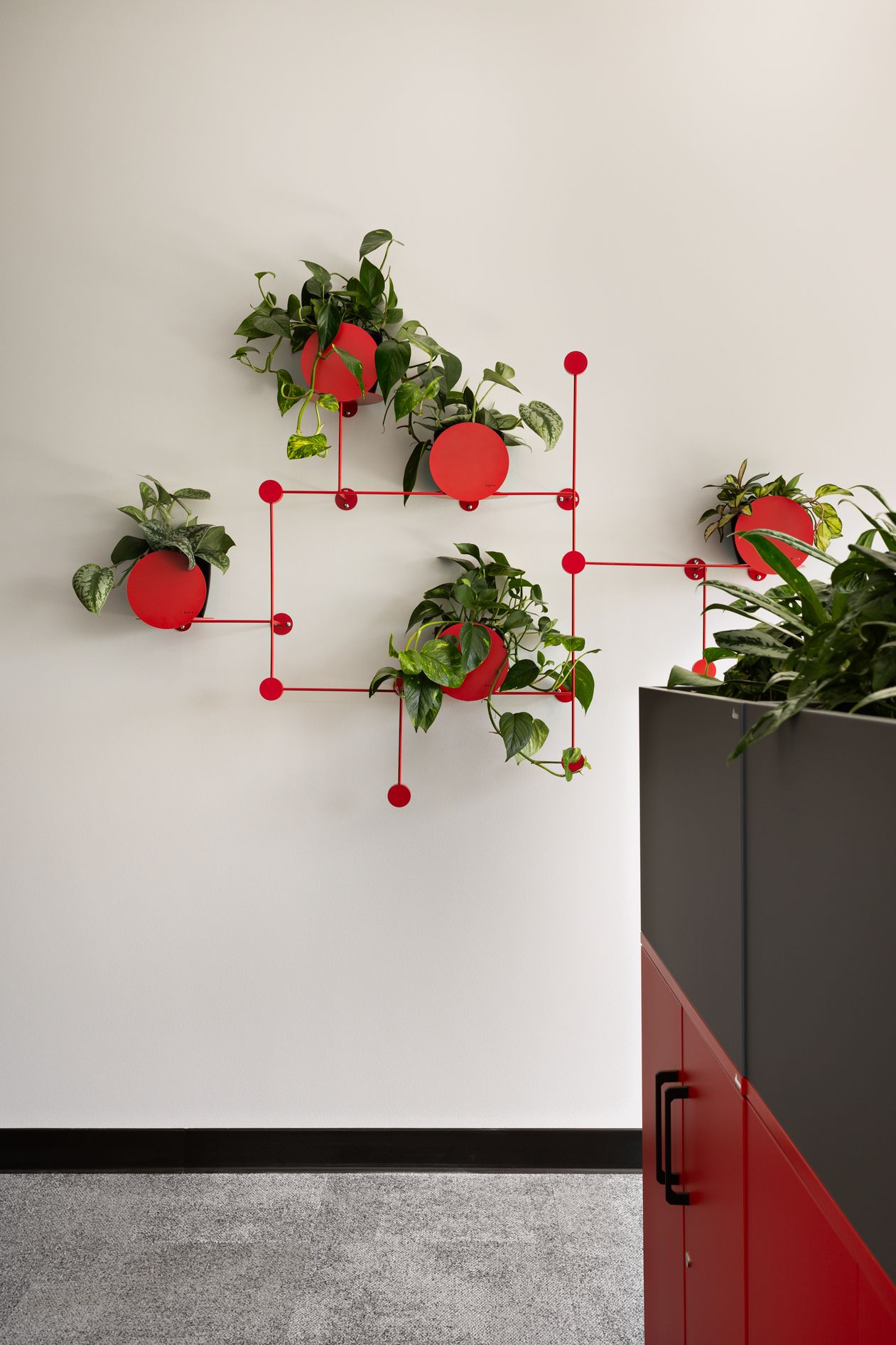 Motywem przewodnim jest tu kolor czerwony, obecny w meblach i detalach, symbolizujący energię, rywalizację i pasję. Nasze rośliny miały być do tego przeciwwagą - zieleń uspokaja, dodaje harmonii i sprzyja pracy w skupieniu.