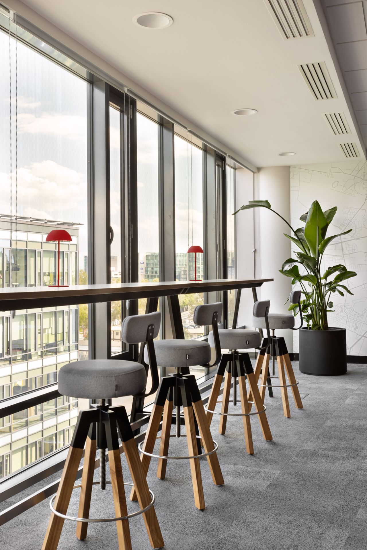 Na otwartej powierzchni biurowej postawiliśmy duże donice z roślinami, które wprowadzają naturalny rytm. Zieleń pojawia się też na biurowych szafkach i lockersach, a tym samym oddziela stanowiska pracy od ciągu komunikacyjnego. W centralnych strefach biura znalazły się m.in. wysokie Strelicje w dużych, okrągłych donicach. Smukłe i wyraziste kwiaty dodają całej aranżacji nienachalnej elegancji.