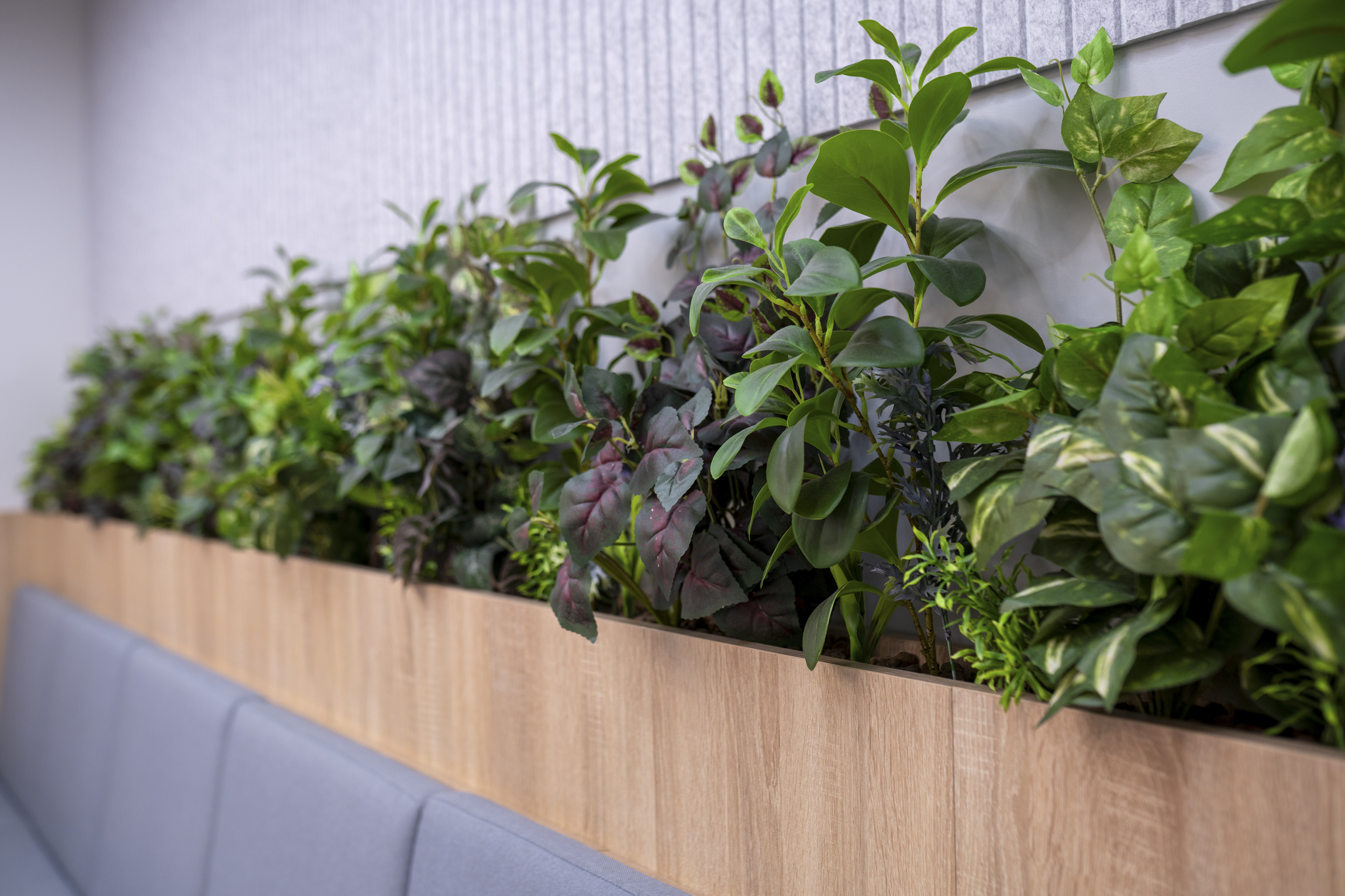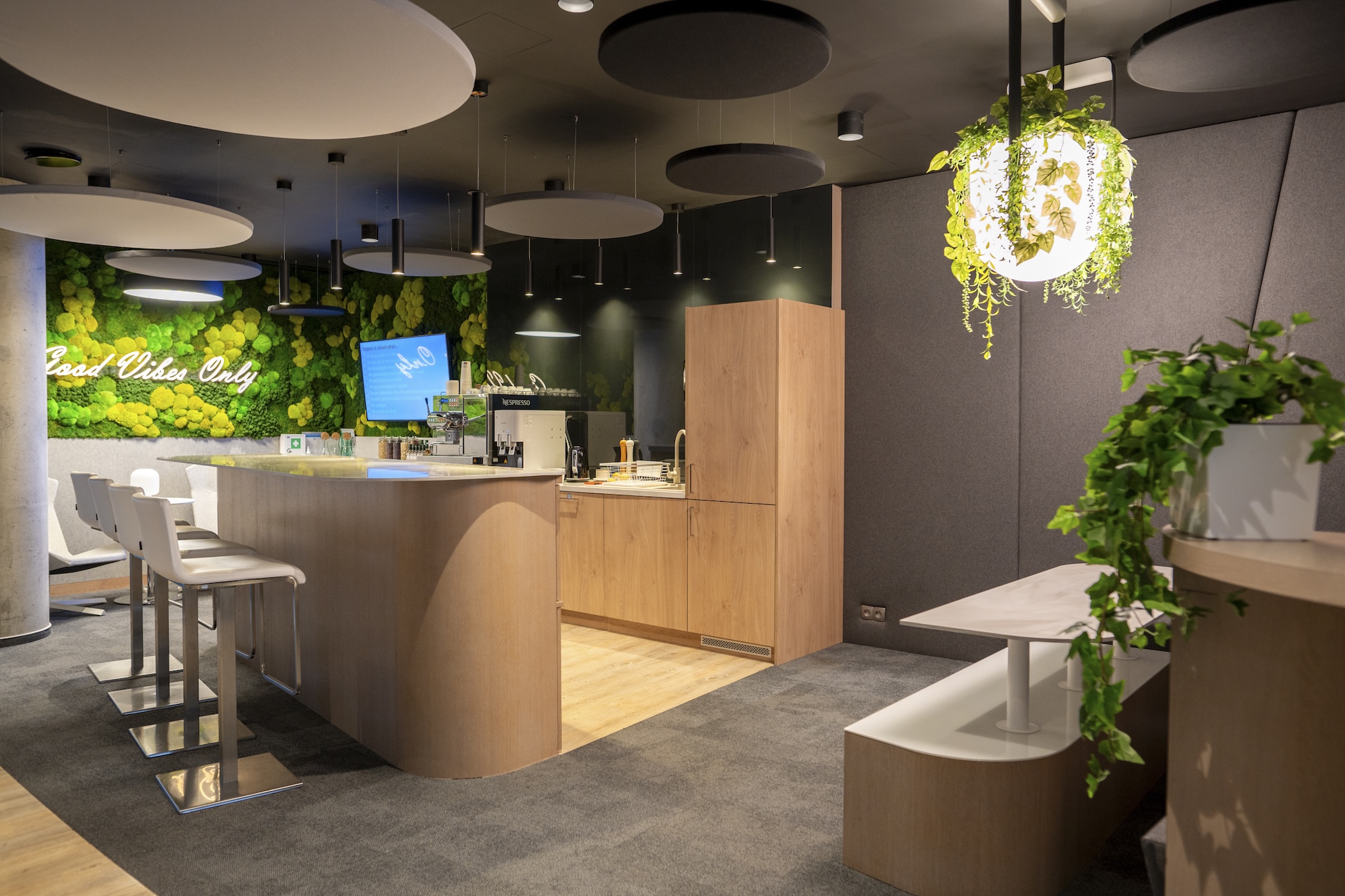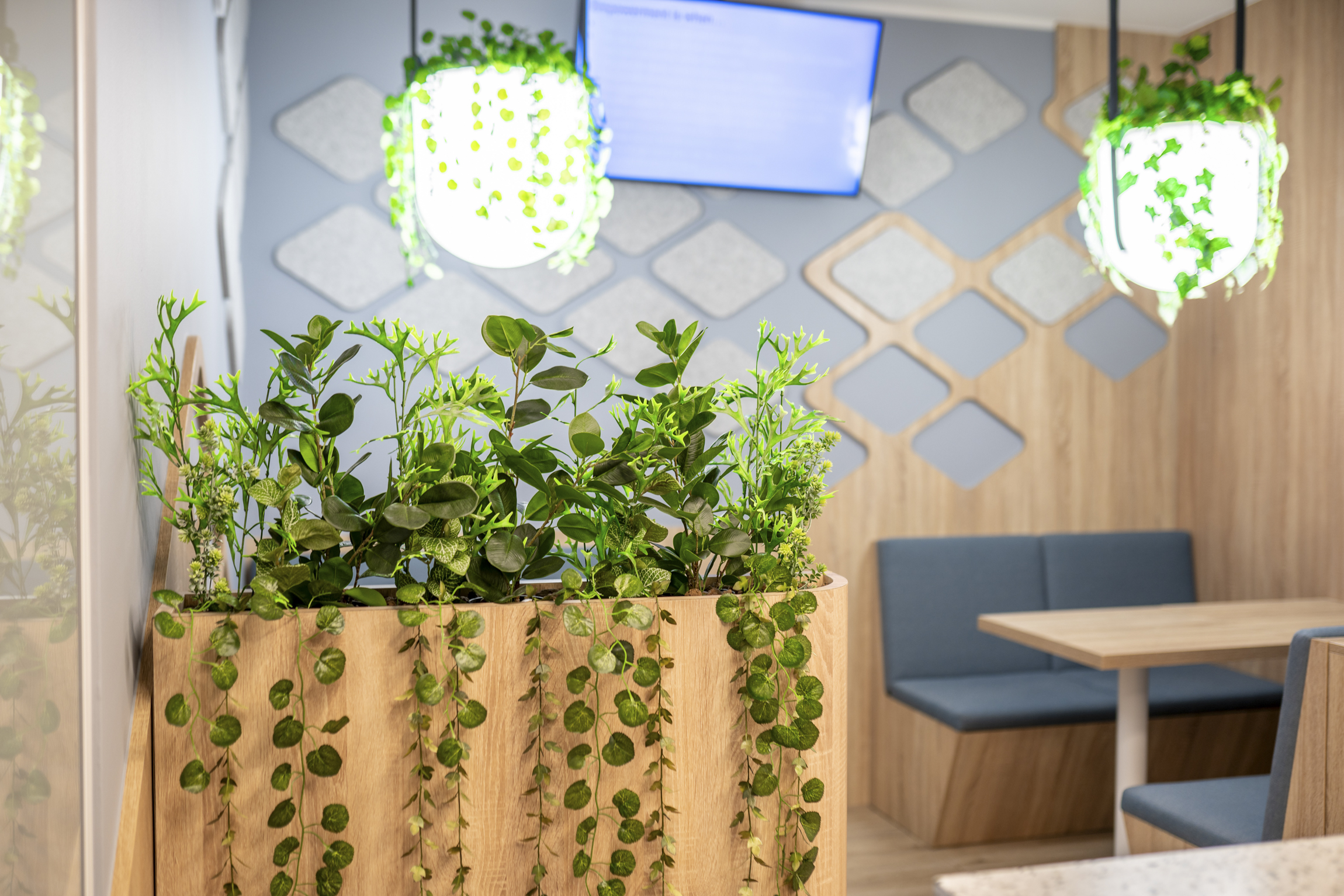 Rośliny znalazły się też w biurowej kuchni, ale tu przyjęliśmy inną koncepcję, na co wpłynął przede wszystkim brak naturalnego światła. Zamiast próbować doświetlać naturalne rośliny, zdecydowaliśmy się na praktyczniejsze w tym wypadku rozwiązanie – aranżację z wysokiej jakości roślin sztucznych. Stawiając na produkty z najwyższej półki mieliśmy pewność, że rośliny będą wyglądać “jak żywe” i wprowadzą dużo pozytywnej energii do tego pomieszczenia. Nie jest w końcu tajemnicą, że już sam kolor zieleni wpływa na zwiększenie produkcji serotoniny, która jest tak ważna w codziennym funkcjonowaniu.