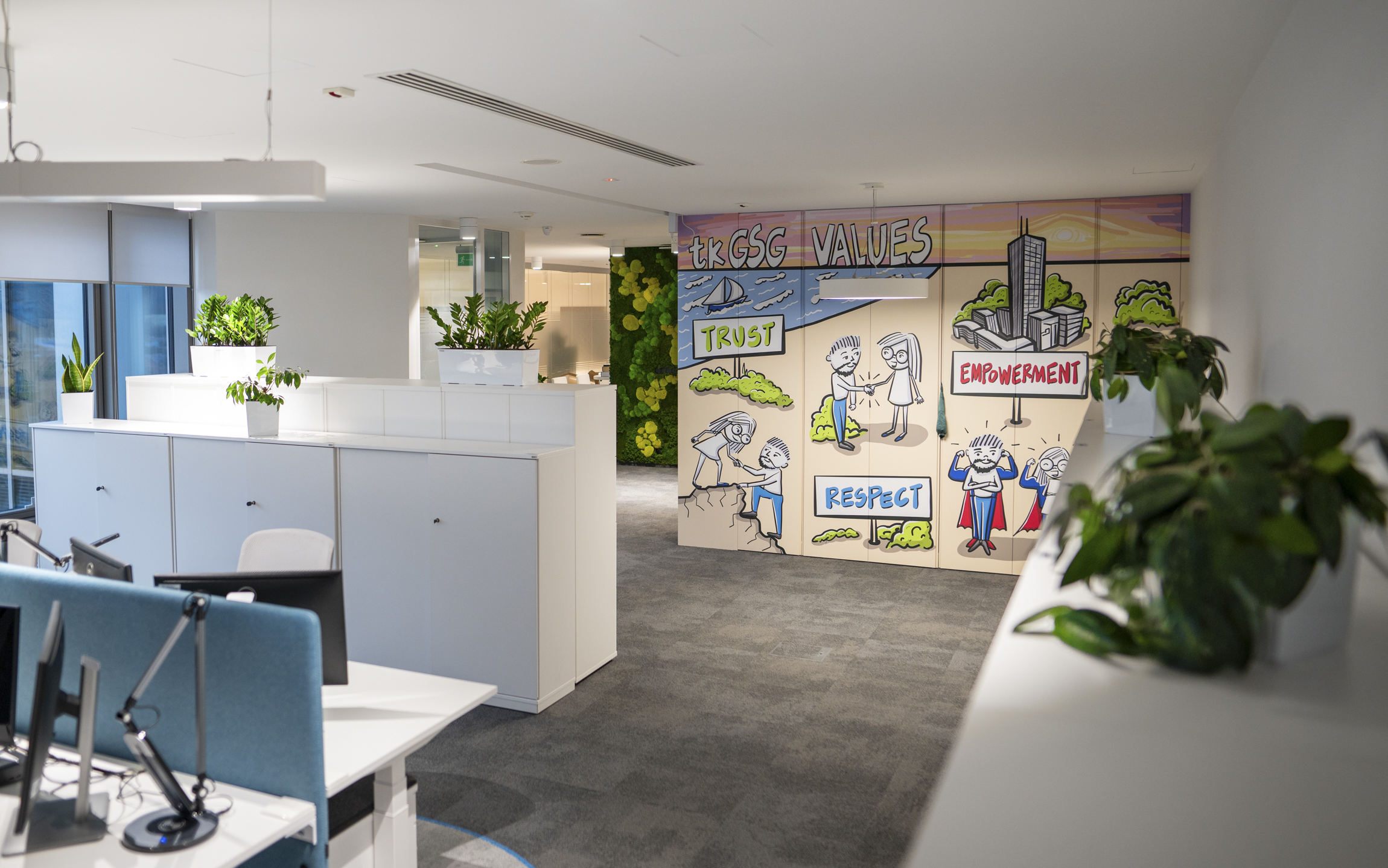 Naturalna roślinność znalazła się we wszystkich strategicznych miejscach biura Thyssenkrupp - w recepcji, w gabinetach, w strefach relaksu i innych strefach wspólnych. W biurze znalazły się m.in.: