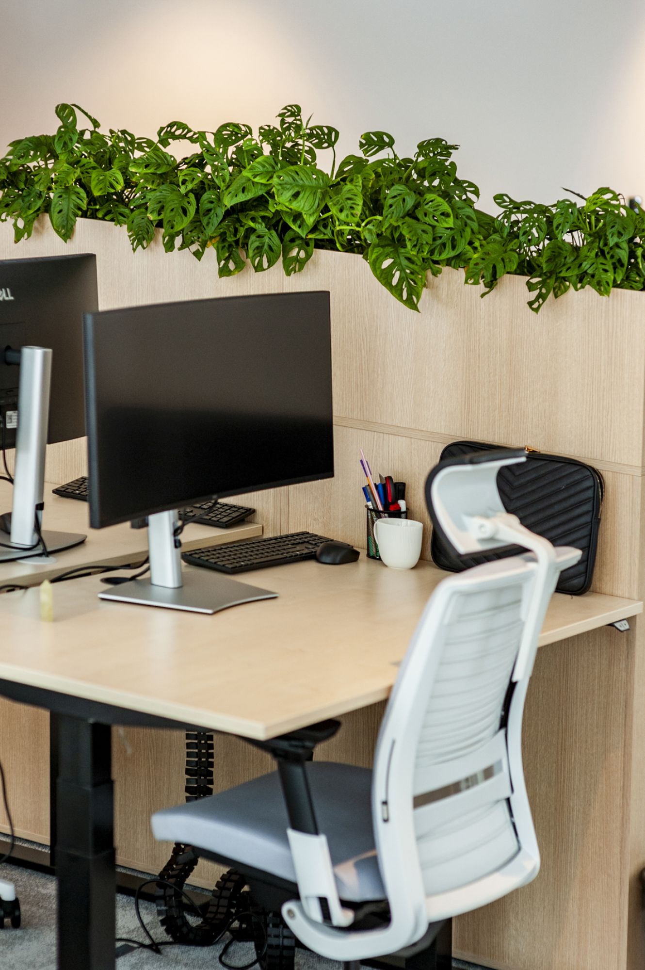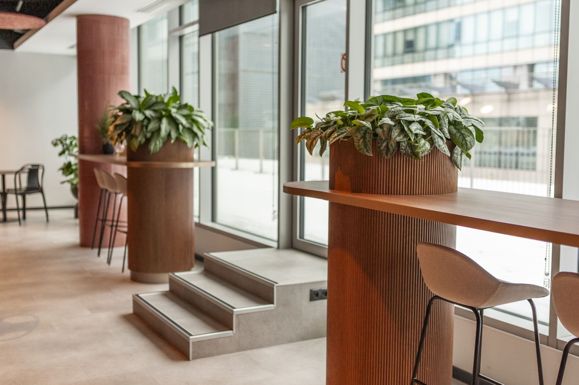 Szybko okazało się, że to, co dobrze wygląda w projekcie wnętrza, nie zawsze jest gotowe na kontakt z naturą. Część mebli nie była przystosowana do posadzenia w niej roślin. Dlatego jednym z najważniejszych zadań było znalezienie odpowiednich wkładów do lockerów, tak aby rośliny wyglądały, jakby wyrastały bezpośrednio z zabudowy, a jednocześnie miały warunki do wzrostu i późniejszej pielęgnacji.