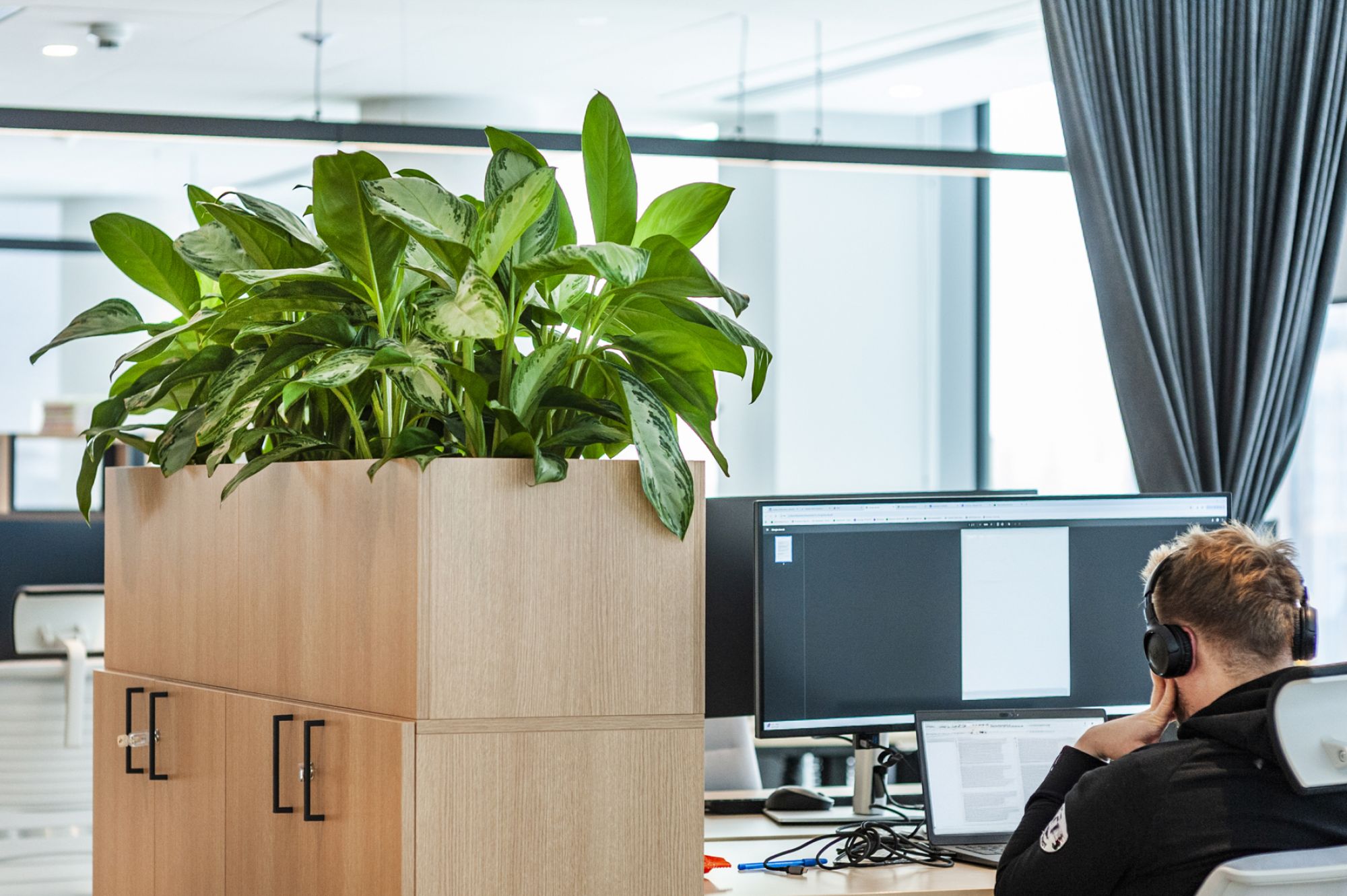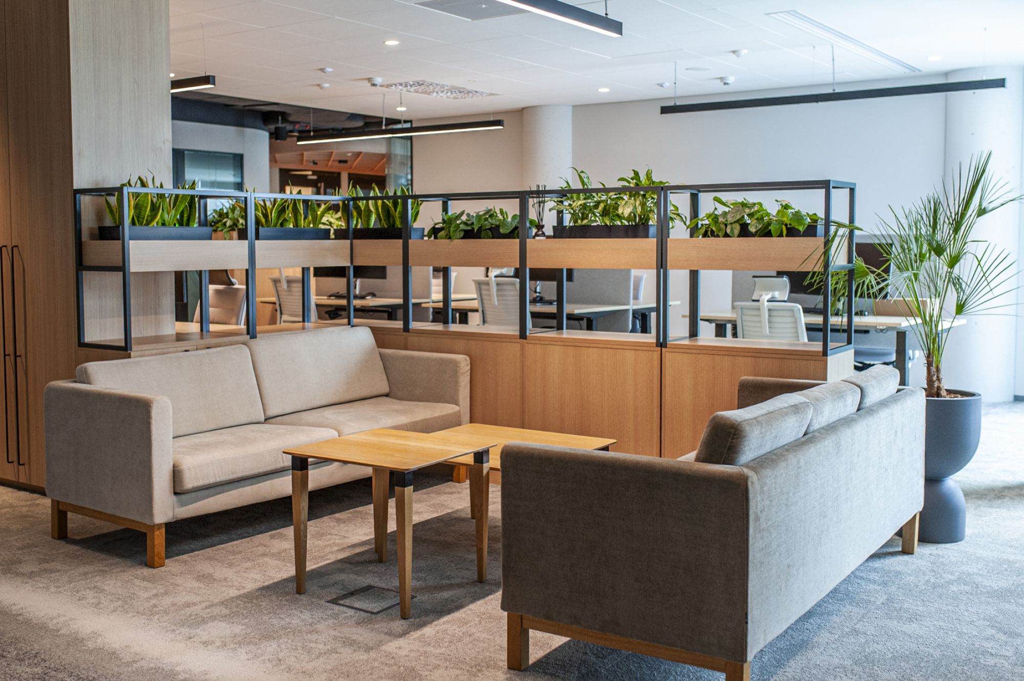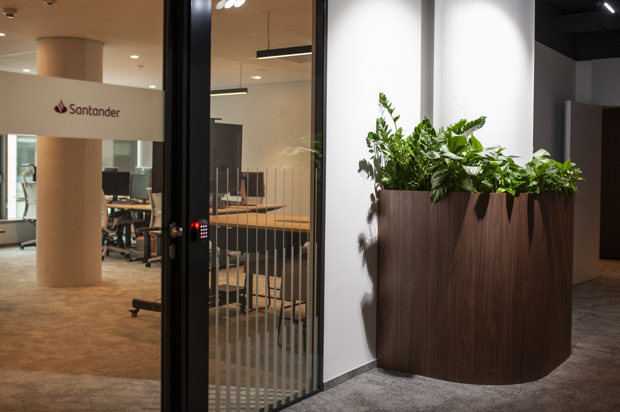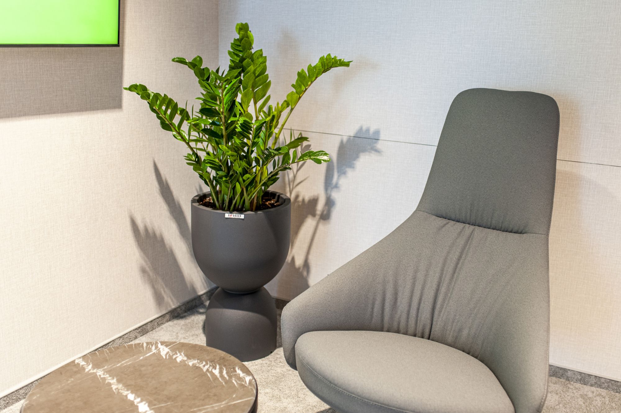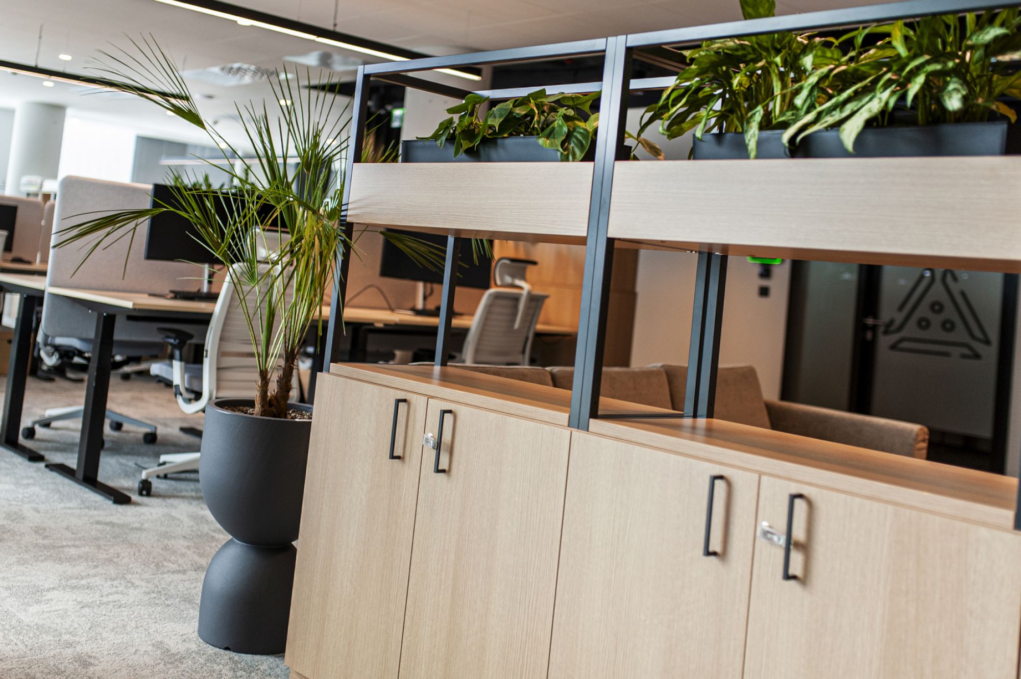 Dzięki dużym gabarytom donic, mogliśmy wprowadzić do biura duże rośliny, które nadają wnętrzu prestiżowy, nowoczesny charakter.