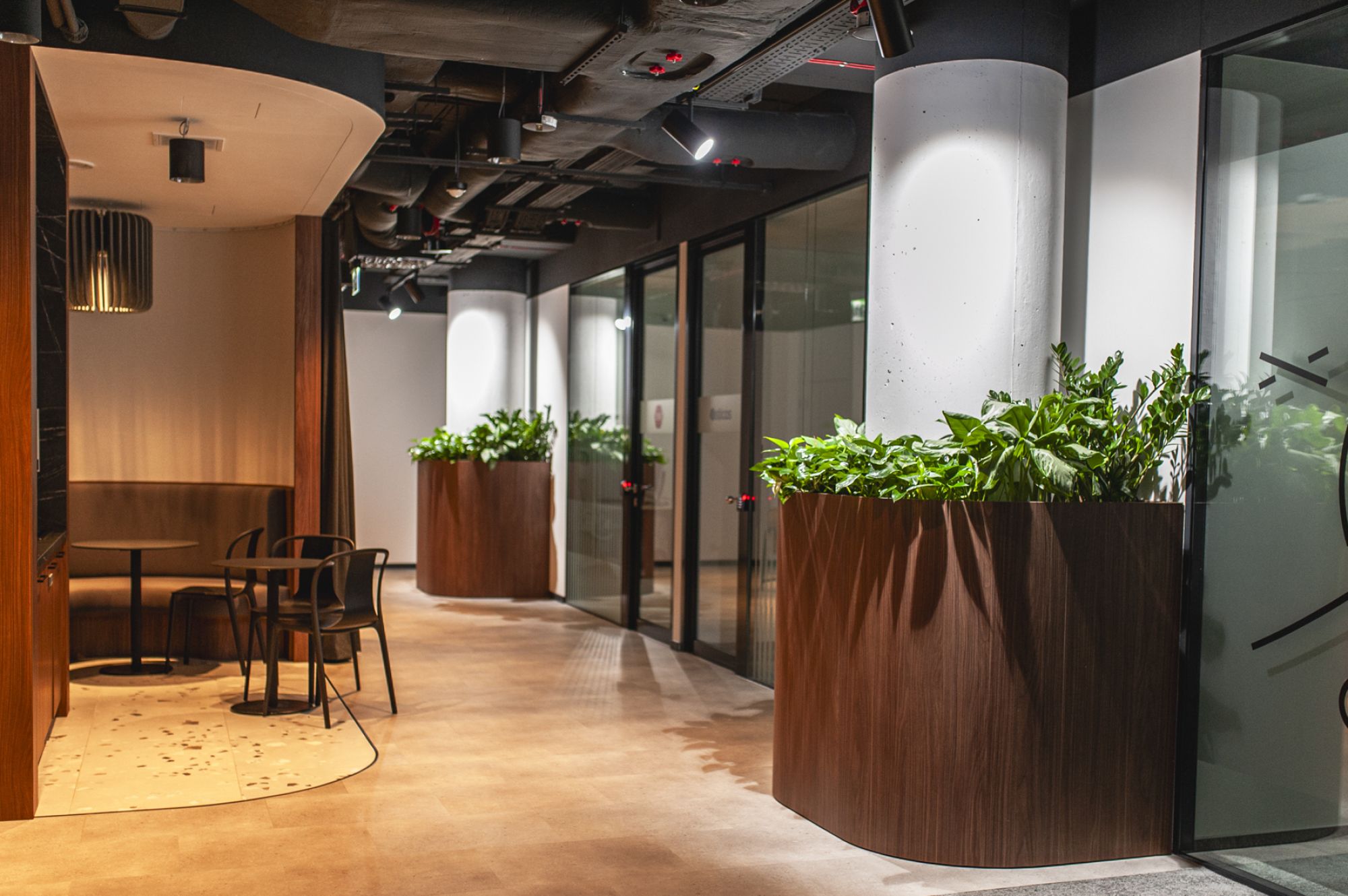 W aranżacji bardzo ważne było to, by rośliny nie wyglądały jak przypadkowo dostawiony element. Biuro miało miękką, zaokrągloną architekturę - obłe linie pojawiały się w ścianach, meblach i elementach zabudowy, dlatego także zieleń musiała wpisać się w ten język wnętrza.