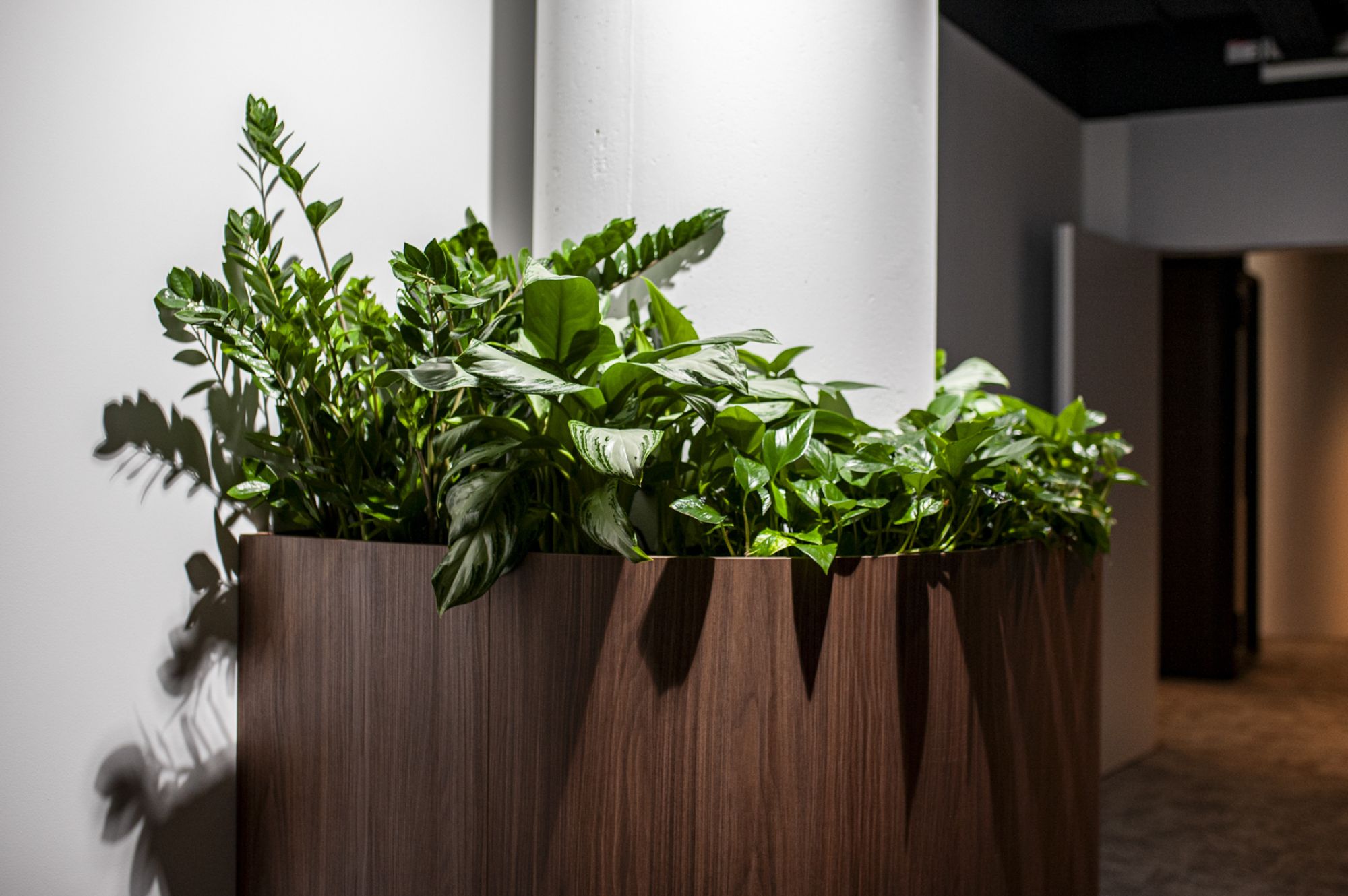 Jednym z większych wyzwań w tym projekcie były donice wokół słupów ustawionych na korytarzach. Miejsca, w których były ustawione, były praktycznie pozbawione naturalnego światła. Klient nie chciał stosować roślin sztucznych, więc trzeba było znaleźć rozwiązanie, które pozwoli utrzymać tam żywą zieleń.