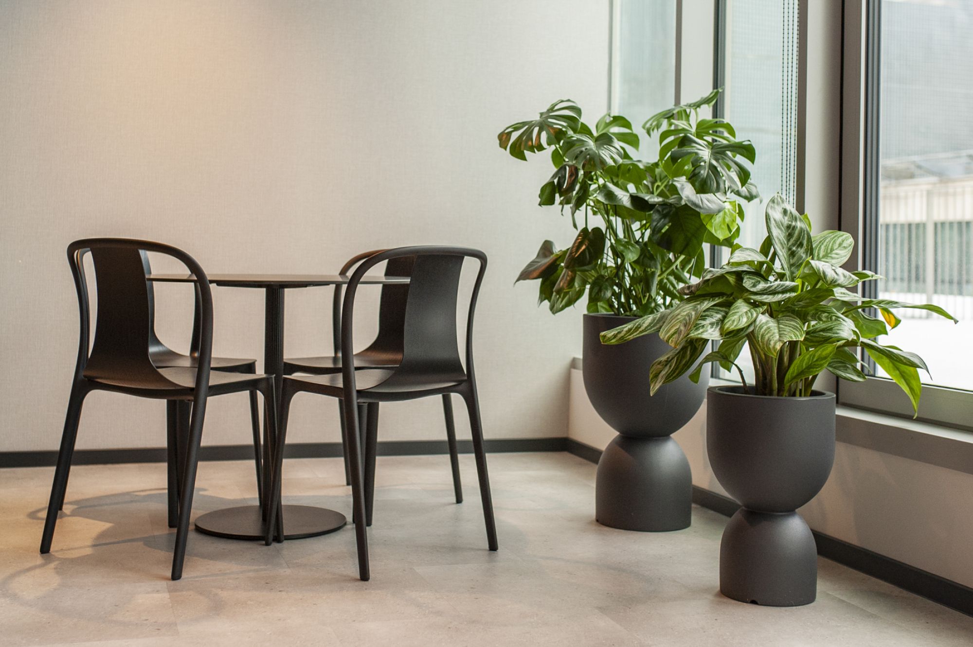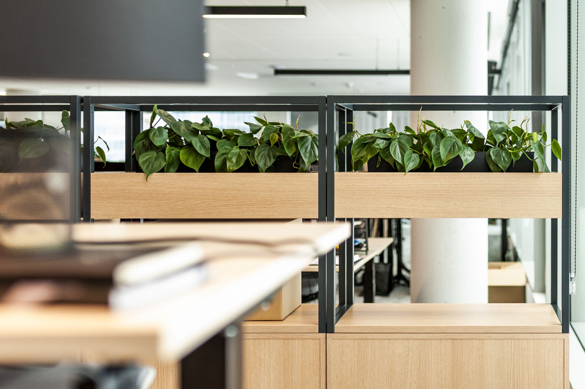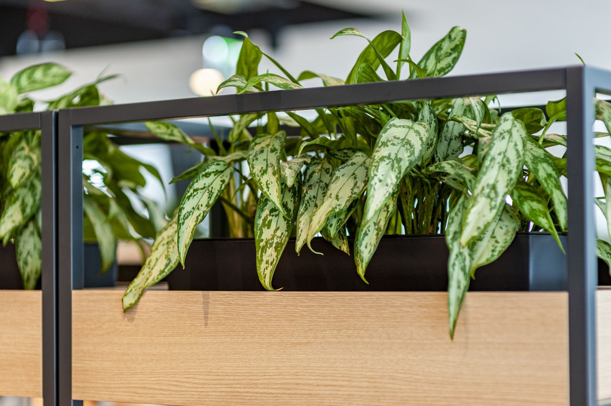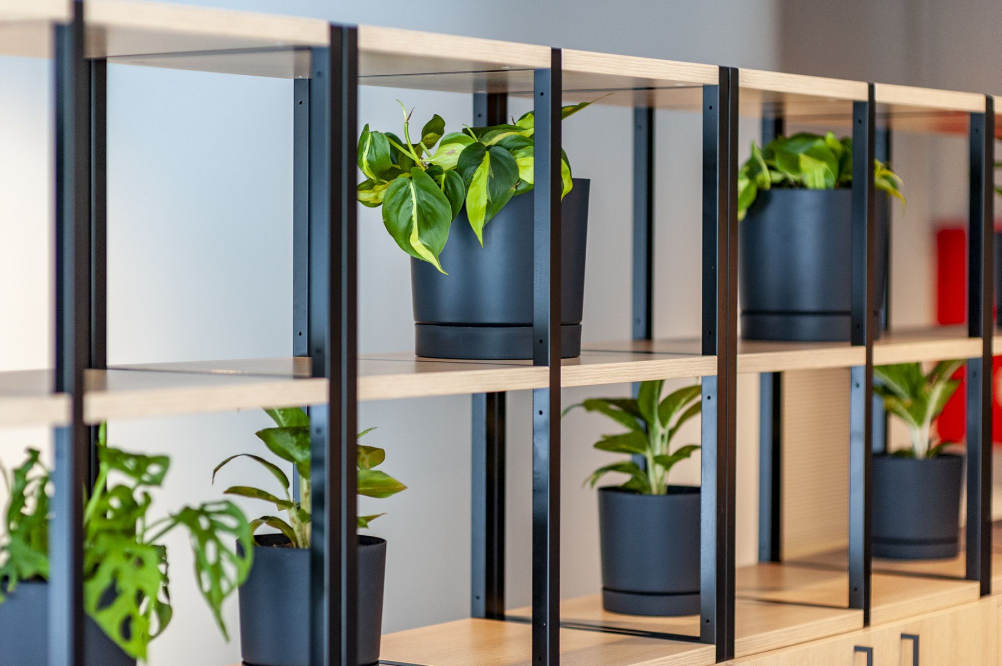 W tej realizacji ważne były nie tylko same rośliny, ale również donice. Wszystkie dodatki dobieraliśmy tak, by współgrały z materiałami obecnymi już w biurze. Ponieważ regały łączyły drewno i metal, postawiliśmy na matowe donice w kolorze antracytowym. Miały nie dominować w przestrzeni, ale podkreślać zieleń i dobrze wtapiać się w całość.