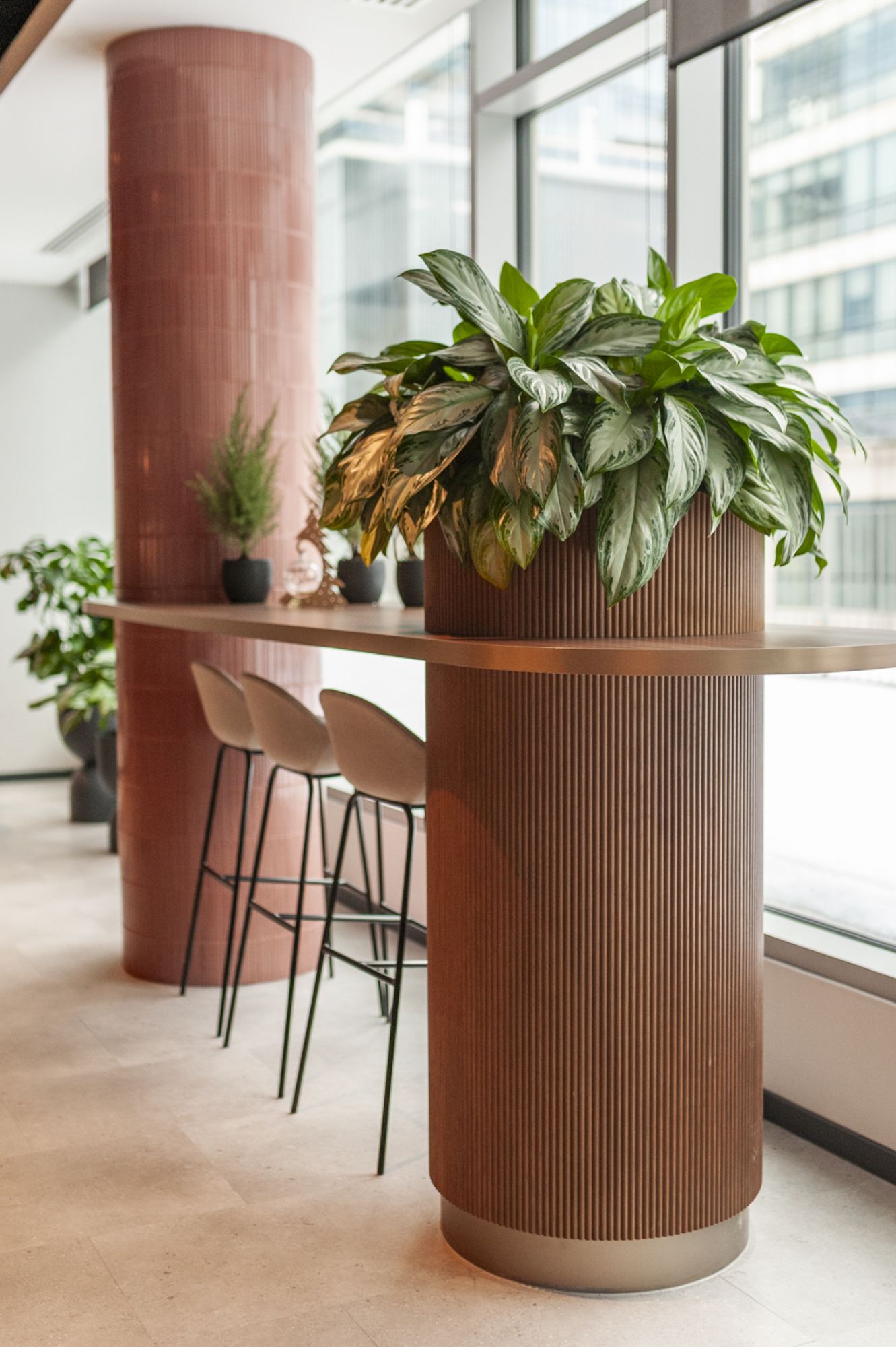 W takich punktach zastosowaliśmy rozwiązanie, które ułatwia późniejszą opiekę nad roślinami. Zamiast sadzić je bezpośrednio w stałej zabudowie, umieściliśmy je w pojedynczych doniczkach, które można wyjmować i rotować w kierunku światła. Wszystko po to, aby roślina rozwijała się równomiernie i z każdej strony jednakowo.