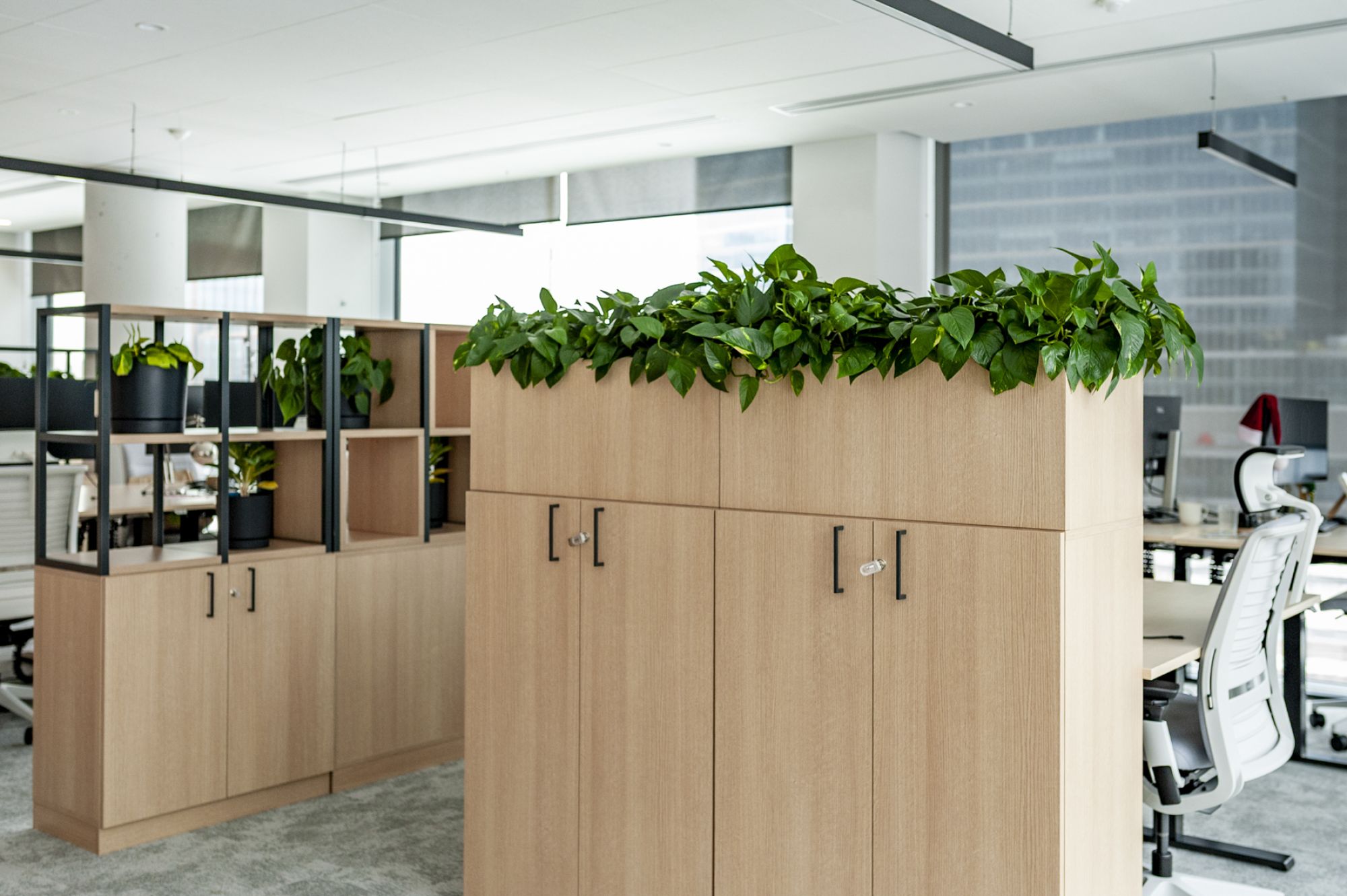 W biurze czekały na nas lockery, regały oraz donice przy słupach, przygotowane wcześniej przez architekta. Naszym zadaniem było więc nie tylko wstawienie zieleni, ale przede wszystkim takie dopasowanie jej do gotowych mebli, by całość nie tylko wyglądała spójnie, ale również sprawdzała się pod kątem użytkowym.