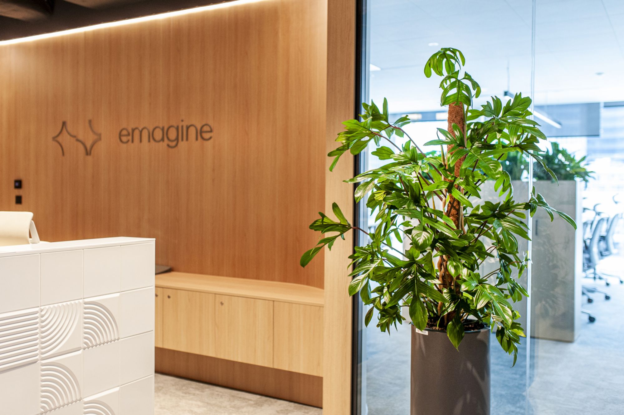 Projekt dla biura emagine przy ul. Wroniej w Warszawie był realizacją, która od początku wymagała od nas szybkiego działania. Klient zgłosił się z potrzebą dostarczenia roślin w bardzo krótkim czasie, a dodatkowym wyzwaniem okazało się to, że część przestrzeni była już wcześniej zaprojektowana i wyposażona w gotowe elementy zabudowy.