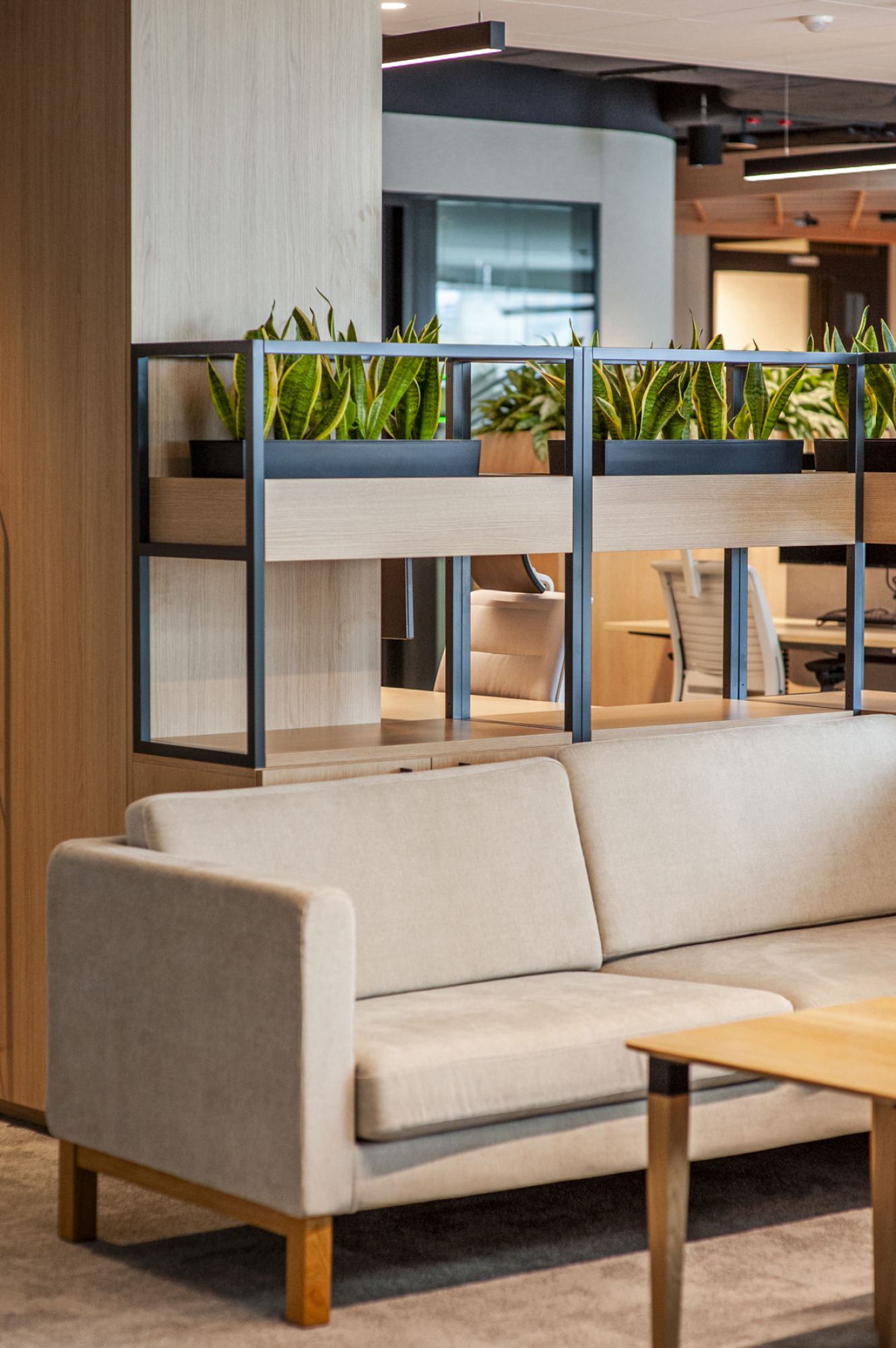 W części wspólnej również pojawiły się nasadzenia w zabudowie - rośliny miały “otulać” pracowników i sprawiać, że zieleń będzie towarzyszyć pracownikom również w tych luźniejszych momentach dnia.